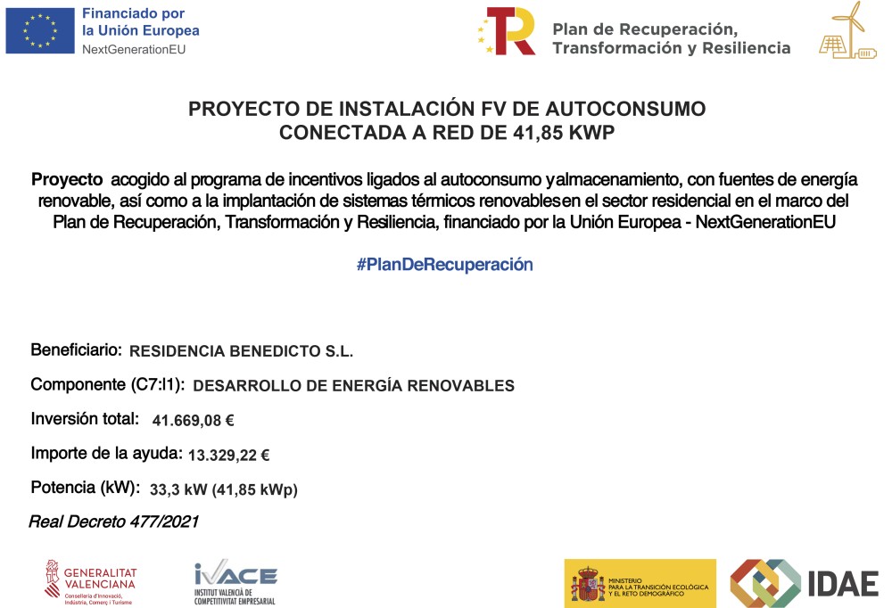RESIDENCIA BENEDICTO S.L. cuenta en sus instalaciones con una instalación de autoconsumo fotovoltaico de 41,85 kWp que ha recibido apoyo financiero otorgado a través del Plan de Recuperación, Transformación y Resilencia, financiado por la Unión Europea – NextGenerationEU.